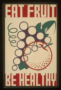 TITLE: Eat fruit - be healthy CALL NUMBER: POS - WPA - NY .01 .E37, no. 1 (B size) [P&P] REPRODUCTION NUMBER: LC-USZC2-5301 (color film copy slide) RIGHTS INFORMATION: No known restrictions on publication. SUMMARY: Poster promoting proper dietary habits, showing stylized fruit. MEDIUM: 1 print on board (poster) : silkscreen, color. CREATED/PUBLISHED: [New York] : Federal Art Project, [between 1936 and 1938] NOTES: Date stamped on verso: Sep 2 1938. Work Projects Administration Poster Collection (Library of Congress). SUBJECTS: Nutrition--New York (State)--1930-1940. Fruit--1930-1940. Health--New York (State)--1930-1940. FORMAT: Posters 1930-1940.Screen prints Color 1930-1940. REPOSITORY: Library of Congress Prints and Photographs Division Washington, D.C. 20540 USA DIGITAL ID: (color film copy slide) cph 3f05301 http://hdl.loc.gov/loc.pnp/cph.3f05301 CONTROL #: 98513528