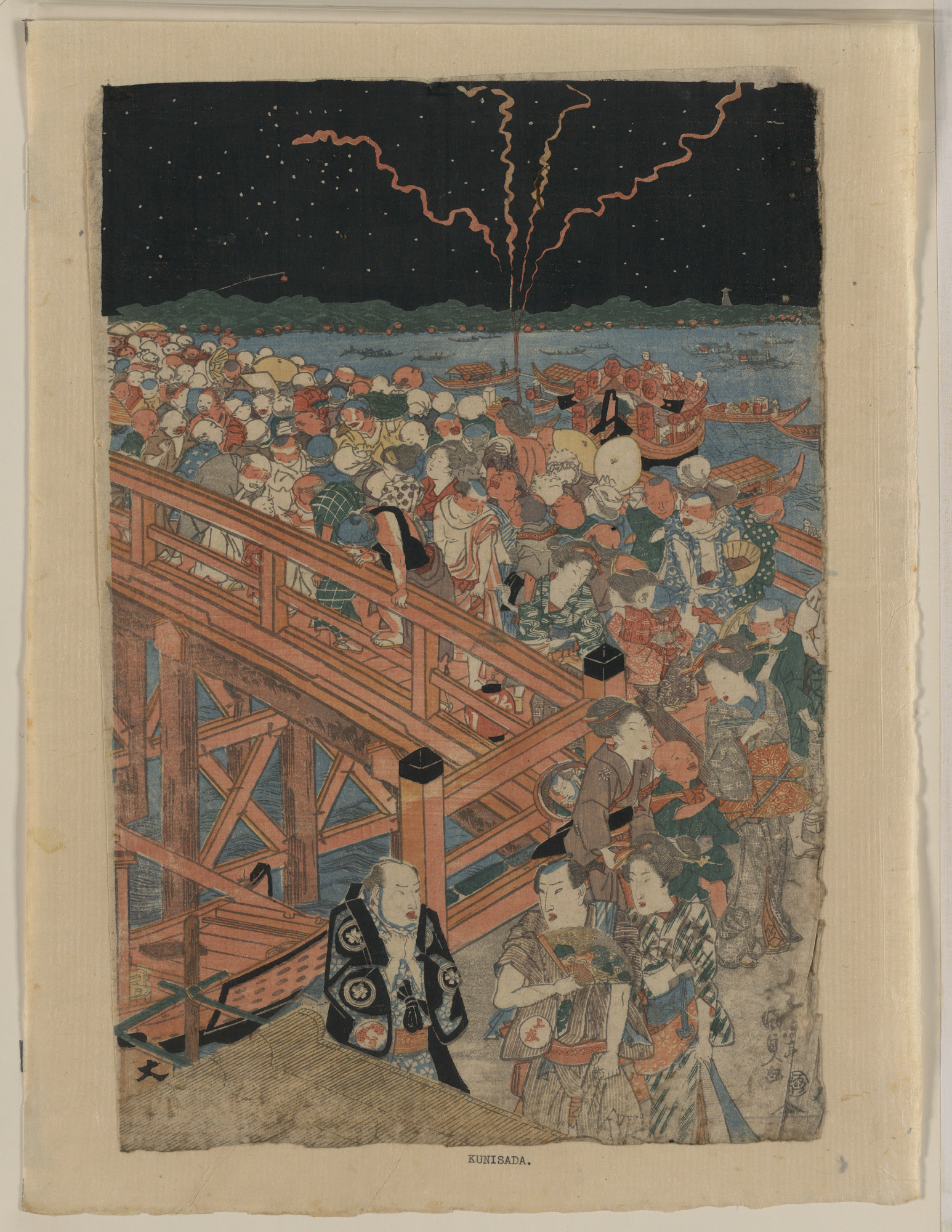 TITLE: Ryōgokubashi no nōryōTITLE TRANSLATION: Cooling off at Ryōgokubashi. CALL NUMBER: FP 2 - JPD, no. 932 (A size) [P&P]Restricted access; material extremely fragile; please use online digital image. REPRODUCTION NUMBER: LC-DIG-jpd-01013 (digital file from original print) RIGHTS INFORMATION: No known restrictions on publication. SUMMARY: Print shows a throng of men and women standing on or crossing the Ryōgoku Bridge during a festival or celebration. MEDIUM: 1 print : woodcut, color ; 37.9 x 25.5 cm. CREATED/PUBLISHED: [between 1818 and 1830] CREATOR: Utagawa, Toyokuni, 1786-1865, artist. NOTES: Title and other descriptive information compiled by Nichibunken-sponsored Edo print specialists in 2005-06. Format: one panel of a vertical Oban Nishikie triptych. Forms part of: Japanese prints and drawings (Library of Congress). SUBJECTS: Bridges--Japan--1810-1830. Pedestrians--Japan--1810-1830. Crowds--Japan--1810-1830. Celebrations--Japan--1810-1830. FORMAT: Triptychs 1810-1830.Ukiyo-e Japanese Color 1810-1830.Woodcuts Japanese Color 1810-1830. REPOSITORY: Library of Congress Prints and Photographs Division Washington, D.C. 20540 USA http://hdl.loc.gov/loc.pnp/pp.print DIGITAL ID: (digital file from original print) jpd 01013 http://hdl.loc.gov/loc.pnp/jpd.01013 CONTROL #: 2008660213