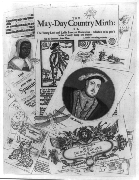 TITLE: The May-Day country mirth: or, The young lads ... CALL NUMBER: PC 3 - 1709 - The May-Day country mirth (A size) [P&P] REPRODUCTION NUMBER: LC-USZ62-86040 (b&w film copy neg.) RIGHTS INFORMATION: No known restrictions on publication. SUMMARY: Composite of head and shoulders portrait of Henry VIII, head and shoulders portrait of a black woman, 3 men with a cannon, a map of Great Britain and Ireland, etc. MEDIUM: 1 print. CREATED/PUBLISHED: 1709. NOTES: Composite of engravings by W. Hollar, I. Callot, John Sturt and others?. Forms part of : British Cartoon Prints Collection (Library of Congress). This record contains unverified data from caption card. REPOSITORY: Library of Congress Prints and Photographs Division Washington, D.C. 20540 USA DIGITAL ID: (b&w film copy neg.) cph 3b32557 http://hdl.loc.gov/loc.pnp/cph.3b32557 CONTROL #: 2002714817