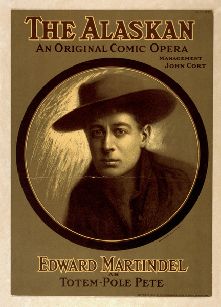TITLE: The Alaskan an original comic opera / from photo by White, N.Y. CALL NUMBER: POS - TH - OPT .A43, no. 1 (B size) <P&P>[P&P] REPRODUCTION NUMBER: _ _ _ _ _ RIGHTS INFORMATION: No known restrictions on publication. MEDIUM: 1 print (poster) : lithograph, color ; 45 x 32 cm. CREATED/PUBLISHED: Cin'ti ; New York : Strobridge Litho. Co., c1908. CREATOR: Strobridge & Co. Lith. RELATED NAMES: Cort, John. NOTES: Created and "copyright 1908 by The Strobridge Litho. Co., Cin'ti & New York." Management, John Cort. Caption: Edward Martindel as Totem-Pole Pete. N.Y. no. 12888. SUBJECTS: Martindel, Edward. Operas & operettas. FORMAT: Portrait prints.Theatrical posters American.Lithographs Color. PART OF: Theatrical Poster Collection (Library of Congress) REPOSITORY: Library of Congress Prints and Photographs Division Washington, D.C. 20540 USA DIGITAL ID: (digital file from intermediary roll copy film) var 0211 http://hdl.loc.gov/loc.pnp/var.0211 CONTROL #: var1993000217/PP