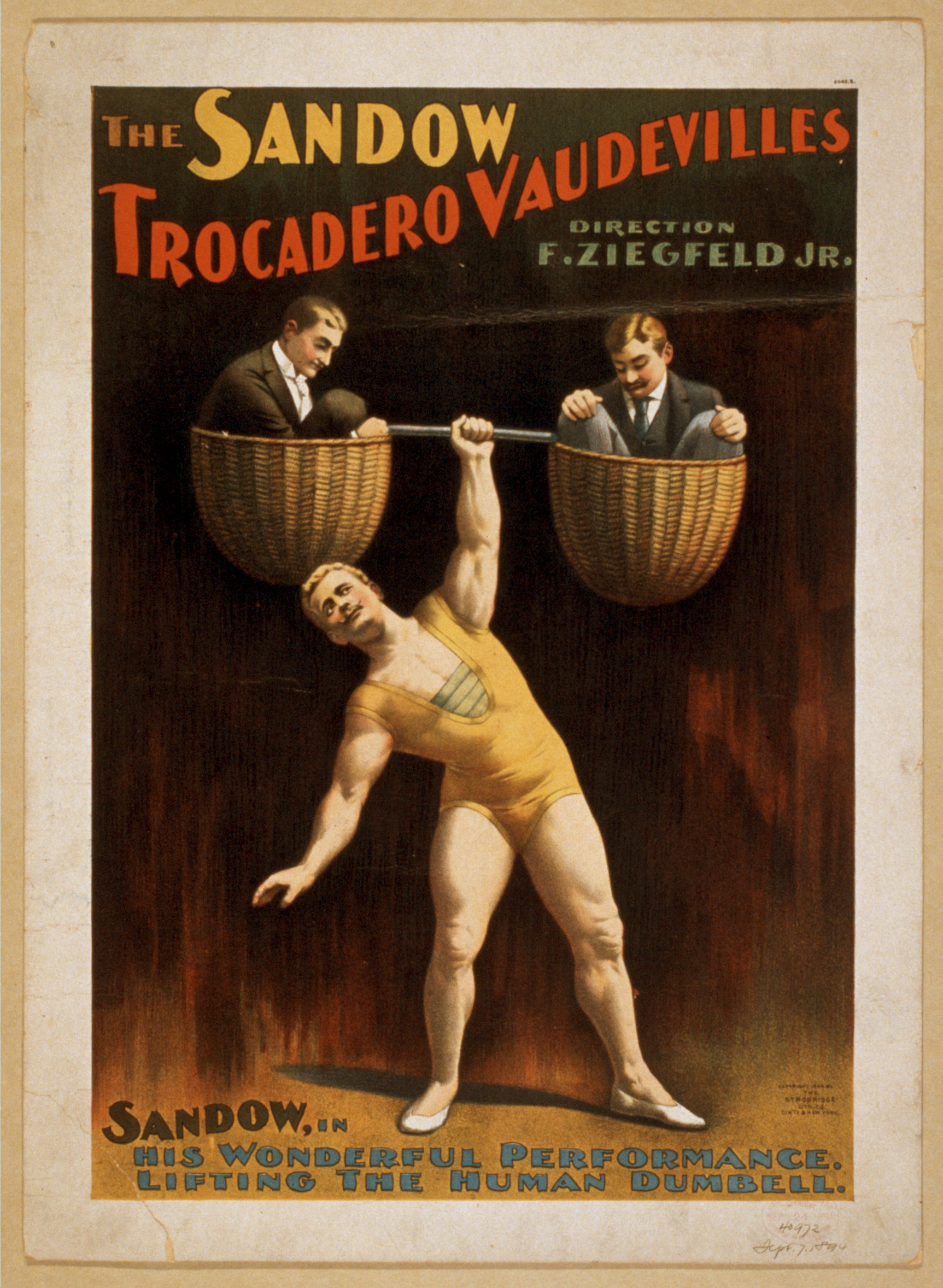 TITLE: The Sandow Trocadero Vaudevilles CALL NUMBER: POS - TH - VAU .S35, no. 3 (B size) <P&P>[P&P] REPRODUCTION NUMBER: LC-USZC4-6075 (color film copy transparency) RIGHTS INFORMATION: No known restrictions on publication. MEDIUM: 1 print (poster) : lithograph, color ; 46 x 33 cm. CREATED/PUBLISHED: Cin'ti ; New York : Strobridge Lith. Co., c1894. CREATOR: Strobridge & Co. Lith. RELATED NAMES: Ziegfeld, Flo, 1869-1932. Sandow Trocadero Vaudevilles. NOTES: Z40972 U.S. Copyright Office Created and "copyright 1894 by The Strobridge Lith. Co., Cin'ti & New York." Direction, F. Ziegfeld, Jr. Caption: Sandow in his wonderful performance, lifting the human dumbell. No. 6045.B. SUBJECTS: Sandow, Eugen,--1867-1935. Weight lifting. Strong men. Vaudeville shows. FORMAT: Portrait prints.Theatrical posters American.Lithographs Color. PART OF: Theatrical Poster Collection (Library of Congress) REPOSITORY: Library of Congress Prints and Photographs Division Washington, D.C. 20540 USA DIGITAL ID: (digital file from intermediary roll copy film) var 0288 http://hdl.loc.gov/loc.pnp/var.0288 (digital file from color film copy transparency) cph 3g06075 http://hdl.loc.gov/loc.pnp/cph.3g06075 CONTROL #: var1993000227/PP